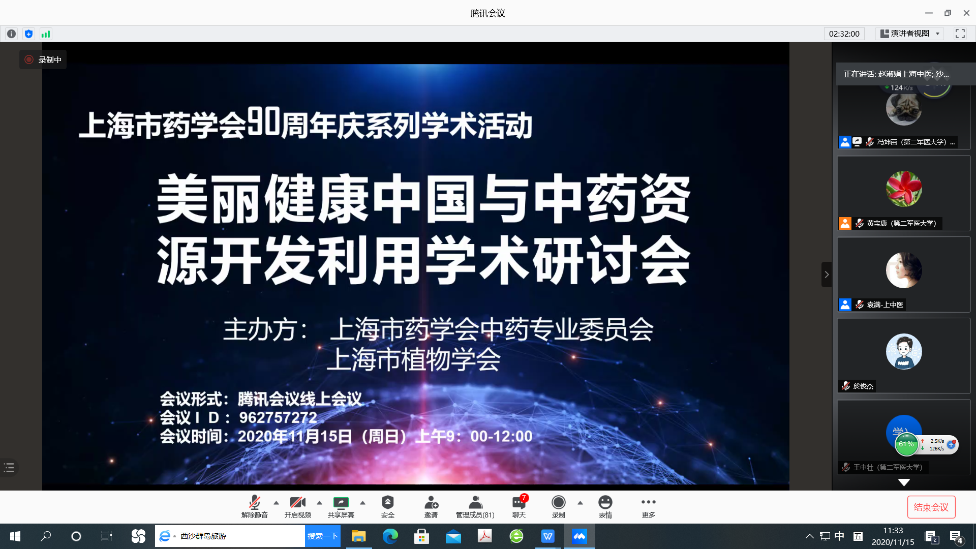 2020年11月15日由上海市药学会中药专业委员会与上海市植物学会通过线上会议形式共同举办了“美丽健康中国与中药资源开发利用学术研讨会”。参加会议的代表来自上海市药学会中药专业委员会以及生药专业委员会、老年专业委员会委员和会员,上海市植物学会的理事和会员,以及从事中药及植物资源相关研究领域的同行和研究生共90余名。中药专业委员会主任委员徐宏喜教授作开幕式讲话。会议邀请了6位专家学者对中药资源可持续利用与健康中国、美丽中国,青山绿水与生态保护等主题内容进行了报告交流。AV视频 院长徐宏喜教授“健康美丽话人参”的报告,风趣而生动地介绍了人参的资源、品质、临床应用以及课题组的研究成果,让大家对人参的认识更进一步。