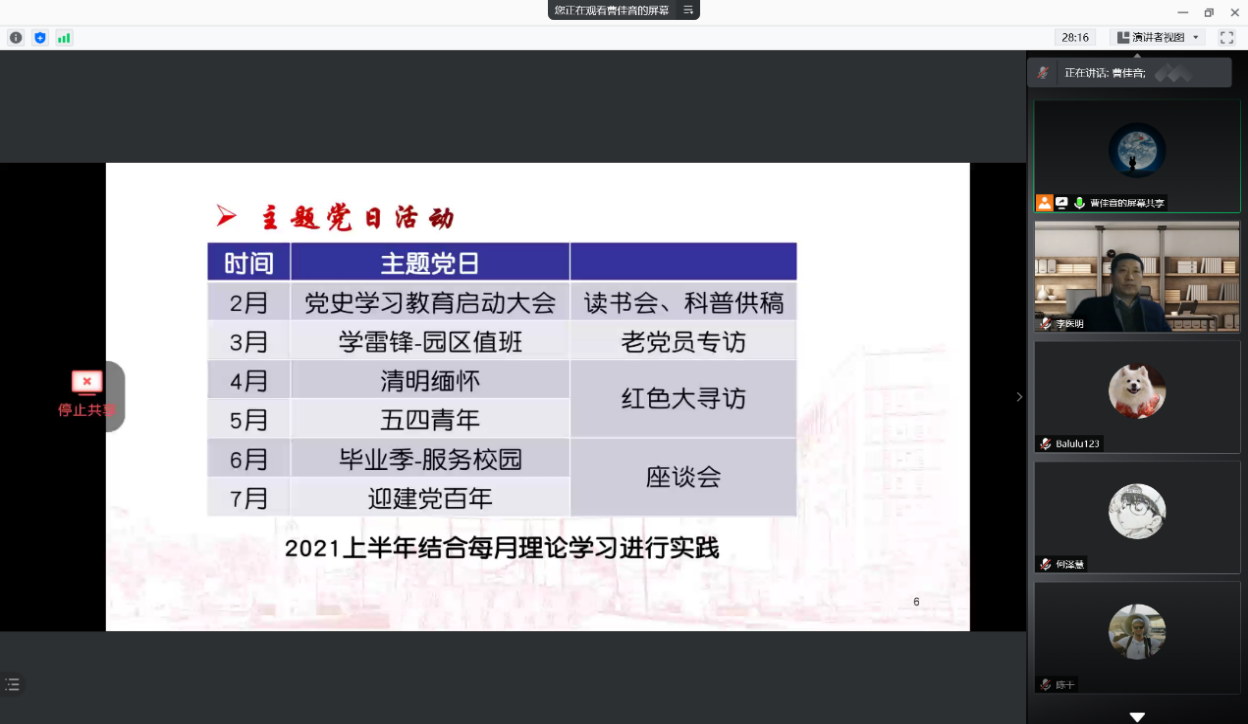作表率以实际行动喜迎百岁华诞,党的百年华诞,举国同庆,研究生党总支为更好地迎接党的百岁生日,总支委员进行策划,并征求了全体党员的意见和建议,以“迎百年、学党史、扬斗志、作表率”为主题的系列活动。具体包括:二月份开展党史学习教育启动大会,增强各党员主动学习党史意识;三月份学雷锋义务活动暨园区值班;四月份清明缅怀纪念革命先烈;五月份举办五四青年活动,扬青年蓬勃朝气;六月份毕业季及服务校园,优异成绩向党献礼;七月份隆重迎接建党百年。活动形式多样,读书会、朋辈分享会、课题组互动交流会、师生党支部共建学习交流会、研究生与本科生党支部共建分享交流会,进社区、进园区、进藏区等研究生党总支经典品牌服务项目……研究生党总支学党史系列喜迎百年项目结合研究生专业和学习实际,内容丰富,意义深远,有利于提高各党员的思想内涵。