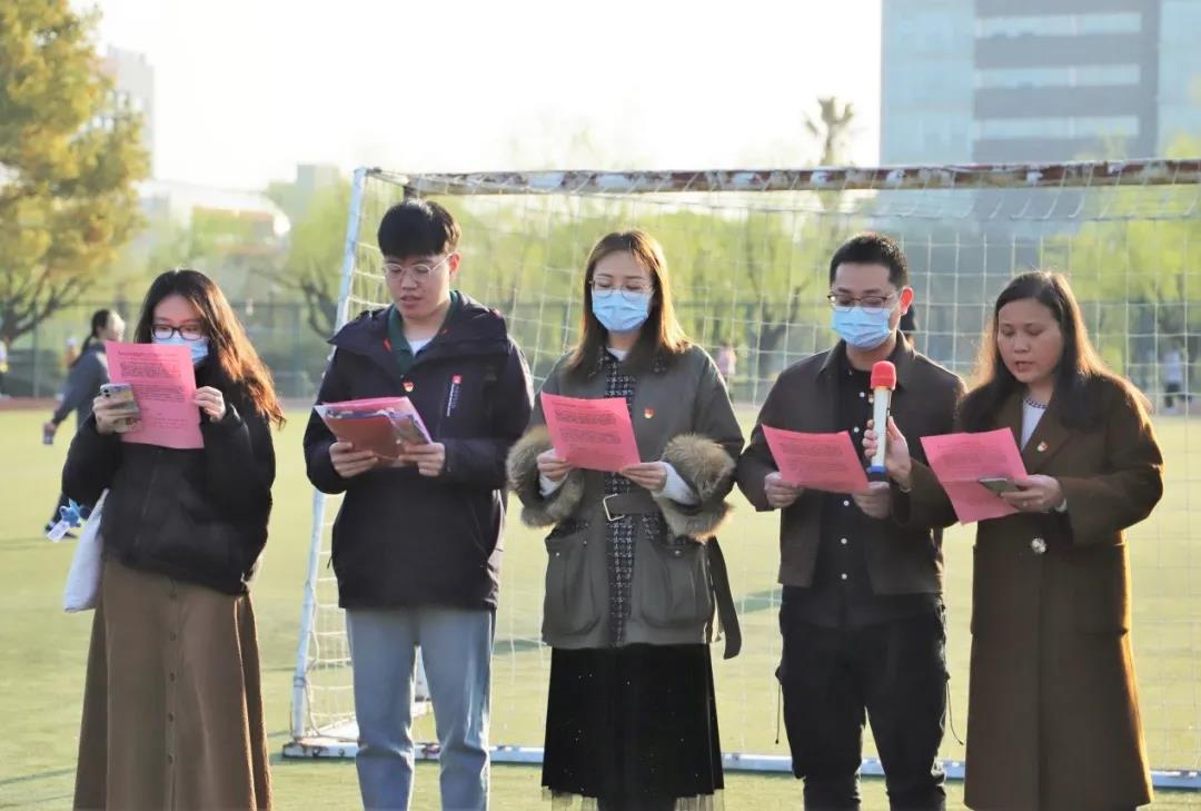 五星红旗在春日七点的朝阳中冉冉升起,师生党员齐唱国歌,党徽与五星红旗交相辉映,中国共产党百年的峥嵘岁月在国歌中一帧帧、一幅幅衍映出来。
