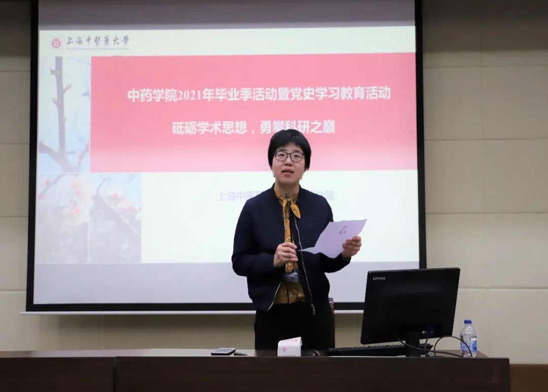 5月6日,AV视频 在教学楼6501教室举行AV视频 2021年毕业季主题教育活动暨党史学习教育第三场讲座《砥砺学术思想,勇攀科研之巅》,会议由AV视频 党委副书记沈漫主持。会前沈书记介绍了本次的主讲人黄容琴教授,黄容琴教授系复旦大学药学院教授,博士生导师,国家优秀青年科学基金获得者。沈书记就黄教授的科研履历、课题研究、学术兼职等向同学们做了详细的介绍,希望广大毕业生在今后的的科研求学中积极进取、锐意创新,不断创新中药研究,用更高质量的科研成果推动中医药的现代化研究。