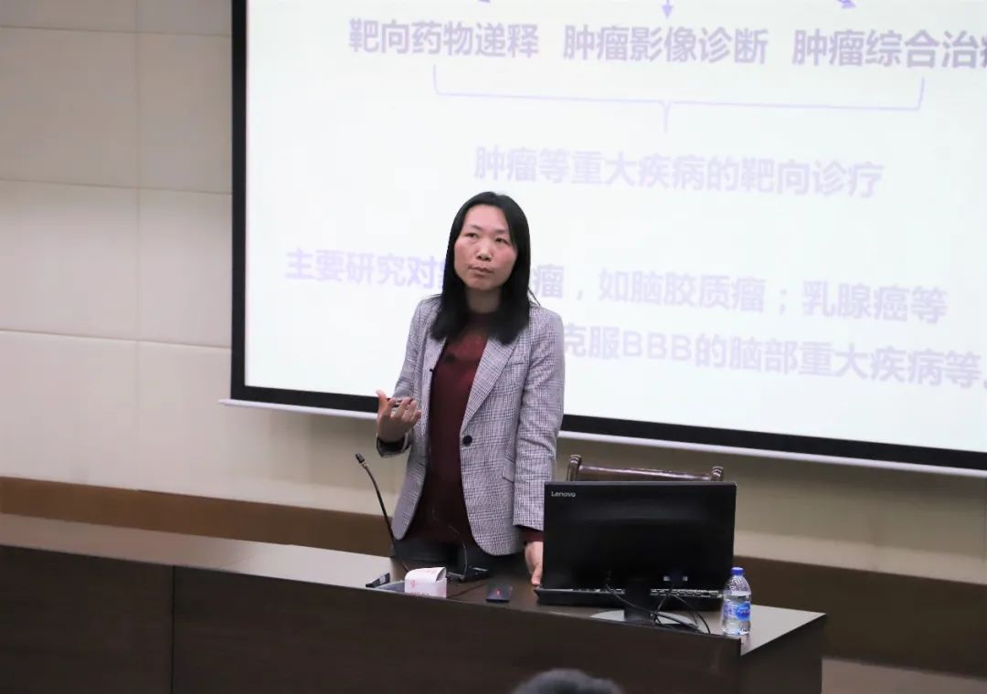 黄容琴教授首先从课题组的研究方向讲起,介绍了课题组在靶向纳米诊疗系统方向的研究情况。以生物可降解型肿瘤药物递送系统为例分享了碳纳米点插入骨架膨胀的降解策略、介孔硅夹层的可降解黑磷纳米片、蛋白冠介导的酸响应降解系统三个方向的成果。分享过程中黄教授引导同学们不断加深思考,了解课题研究背后所需的各项能力与素养,做好从本科生到研究生角色的转变。