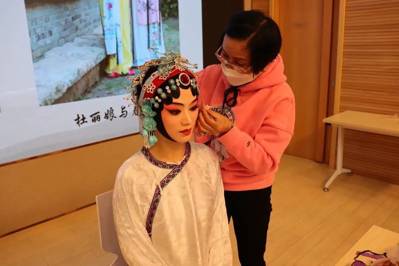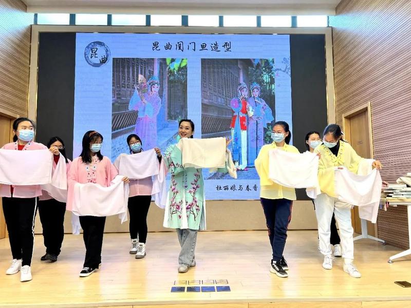 我们了解到昆曲演员光鲜的背后,离不开一个团队的努力。“昆曲是一个团队艺术,大家共同的努力才能呈现舞台上的美妙。”赵津羽介绍到。同学们看到夏晴老师扮演的杜丽娘出场时,都被其造型与装扮所惊艳,同时也被昆曲的魅力所折服。