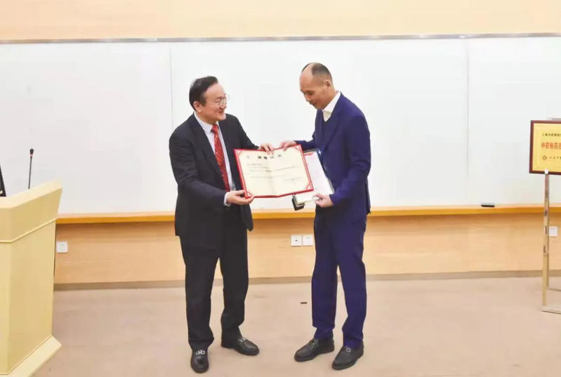 徐建光向国家级非遗项目中药炮制技艺(人参炮制技艺)传承人、福参源保健品有限责任公司董事长王俊良颁发客座教授聘书,并为其佩戴校徽。王俊良向AV视频 捐赠2支野山参珍品作为上海中医药博物馆藏品陈列展示。