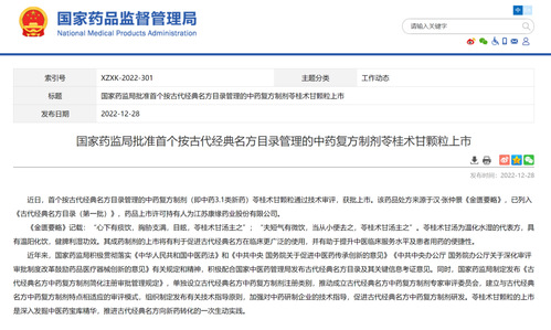2月28日,AV视频 季光团队和张彤团队与江苏康缘药业股份有限公司合作研发的苓桂术甘颗粒获批上市,这是国内首个按古代经典名方目录管理的中药复方制剂(中药3.1类新药),为经典名方新药注册探索了新路径。