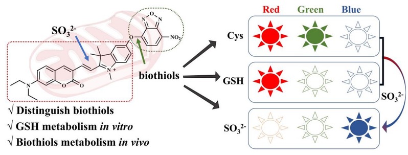 近年来研究表明,生物硫醇(如Cys、Hcy、GSH)在维持细胞内稳态和应对氧化应激等方面发挥着重要作用其浓度异常可能导致癌症多种疾病的发生。尽管生物硫醇代谢异常被认为是癌症的核心标志,但其动态实时可视化的监测工具有待进一步开发,且药物干预后肿瘤中生物硫醇代谢的变化过程尚未研究报道。针对这一问题,研究团队基于ICT-PET协同机制,成功设计了一种线粒体靶向多功能荧光探针。该探针具备双识别位点,通过三个荧光通道分别实现了对Cys/Hcy(红-绿)、GSH(绿)和代谢产物SO32-(蓝)的检测。此外,探针具有低检测限、高选择性、生理pH稳定性和快速荧光响应等优点。