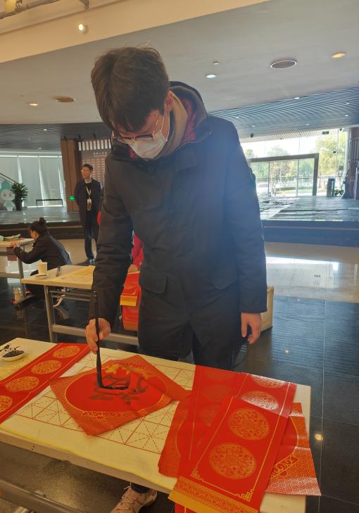 活动伊始,书画专家陆文耀启动“翰墨迎新”书法撰写活动。书法家高壁为师生们讲解握笔和运笔的方法,并现场示范书写“福”和“龙”,用浓墨倾情为师生们送上新春祝福研究生党总支成员们也跃跃欲试,亲手书写下一幅幅迎春祝福。