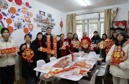 随后,学院领导班子与寒假留校学生在云苓楼思齐工作室制作窗花、灯笼和对联。岁寒情暖,在春节即将来临之际师生欢聚,共同制作充满传统文化要素的窗花、灯笼和对联,为寒假生活增添了浓浓的“年味”。最后,老师们为留校学生赠送精心准备的新春大礼包,寓意新年吉祥如意和最诚挚的新春祝福。