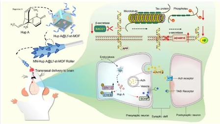 该研究设计了一种可溶解微针和纳米载体相结合的鼻-脑药物递送系统。通过使用透明质酸形成的微针和丹宁酸交联明胶作为贴片基座,制成了一种类似牙刷的微针贴片,这些微针在几秒钟内完全溶解于鼻黏膜中,释放出负载的环糊精基金属有机框架(CD-MOFs),不会影响鼻毛细胞和鼻微生物群落。作为高负载石杉碱甲的纳米载体,这些以钾为结构的CD-MOFs,被豆甾醇作为稳定剂增强了水中稳定性,再经乳铁蛋白功能化,能够实现有效的脑靶向药物传递。该新型经鼻脑靶向递药策略显著增强了治疗H2O2和东莨菪碱 (scopolamine,SCOP)诱导PC12细胞构建细胞损伤模型。另外,显著改善了石杉碱甲对SCOP和D-半乳糖&AlCl3致大鼠记忆障碍的疗效,分别通过激活ERK-CREB-BDNF蛋白通路、增强PSD95蛋白表达,以及改善Tau蛋白异常磷酸化和调控BACHE1、ADAM10减少Aβ蛋白。这种巧妙设计的给药系统为高效脑内递药提出了新的解决方案,且进一步明确了石杉碱甲对于阿尔茨海默症的潜在治疗作用。