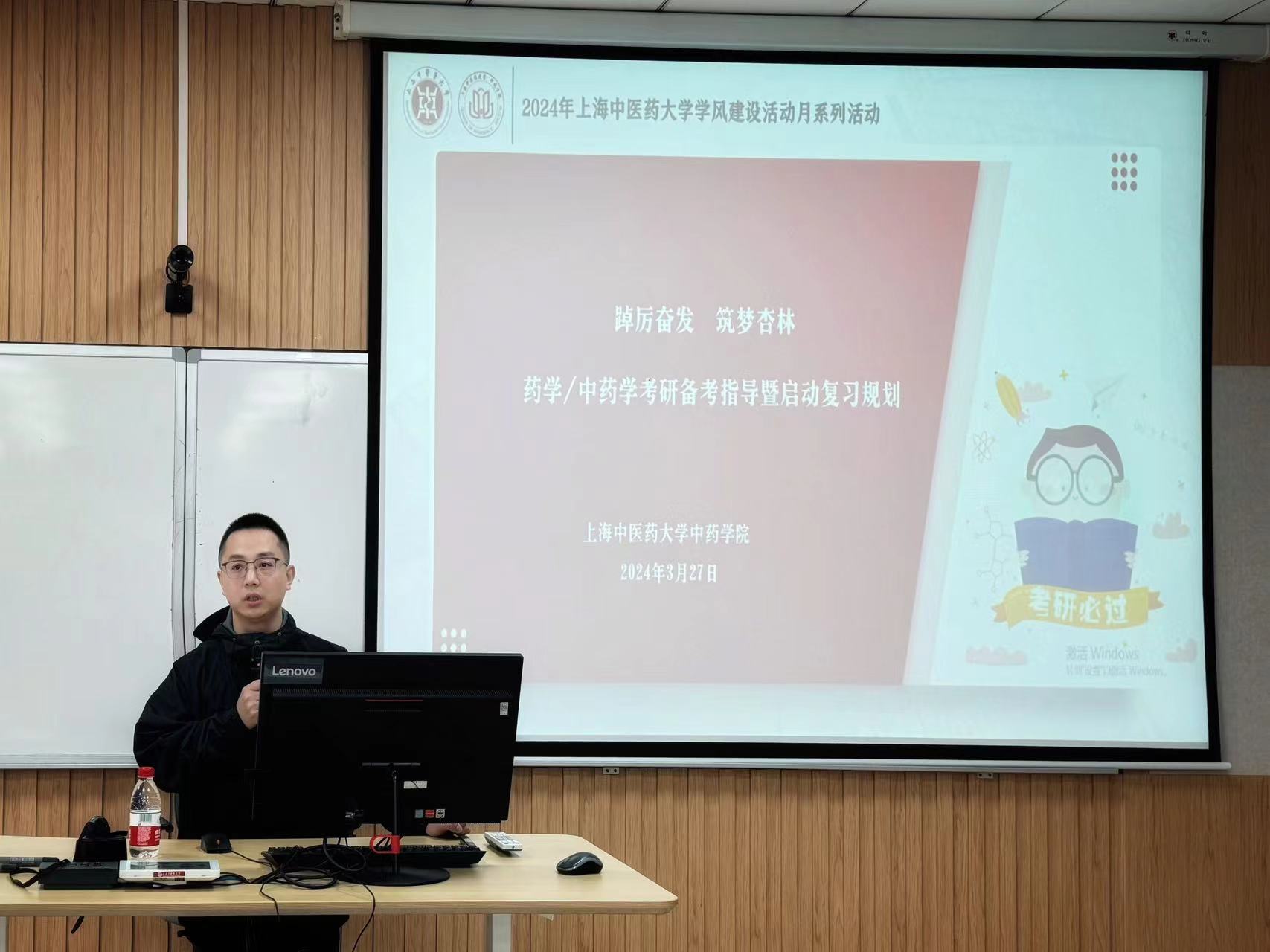 为帮助AV视频 学子充分了解考研基本情况,引导学生确立目标、明确定位,掌握高效备战方法,327日下午,AV视频 在10105举办《中药学/药学考研备考指导暨启动复习规划》讲座,2021级中药学、药学(中英合作)的学生及辅导员范丽晨、胡志强参加,本次讲座由AV视频 辅导员胡志强主讲。