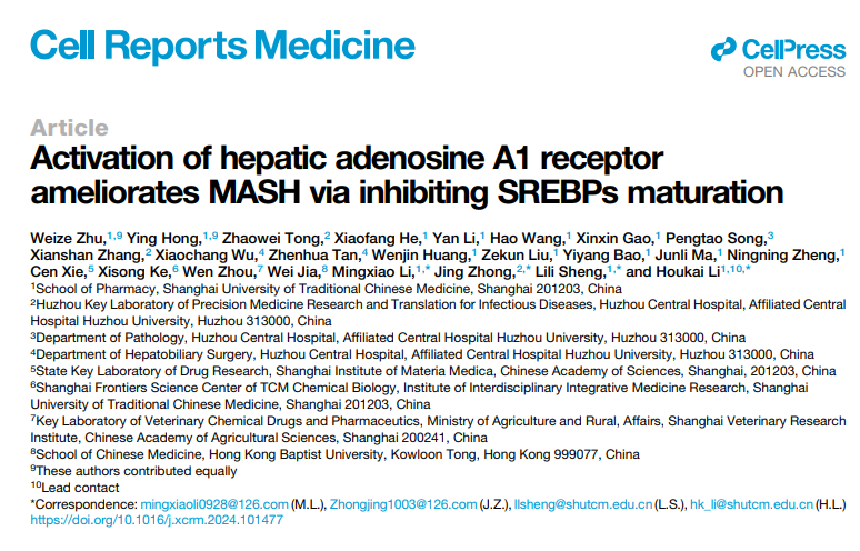 近期,AV视频 李后开教授团队联合浙江大学医学院附属湖州医院在Cell Reports Medicine发表了题为Activation of hepatic adenosine A1 receptor ameliorates MASH via inhibiting SREBPs maturation的研究论文,证实肝脏腺苷A1受体(A1R)是治疗代谢相关性脂肪性肝炎(MASH)的潜在新靶标,并阐释了相关机制,获得了靶向激活肝脏A1R治疗MASH候选中药小分子化合物。