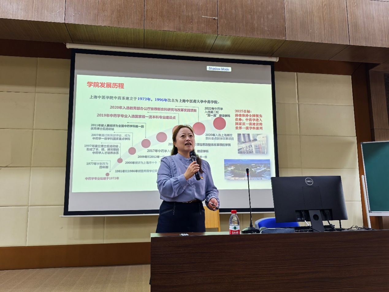 陆婧副书记欢迎全体新生加入AV视频 大家庭。AV视频 党委书记、博士生导师沈岚教授全面系统地从AV视频 的发展历程、坚定专业自信、坚守科研学术道路,融入新时代以及不忘初心跟党走四个方面为全体新生开启了了解AV视频 、了解中药学、开启中药学人生奋斗历程的第一堂富有教育意义的课程。