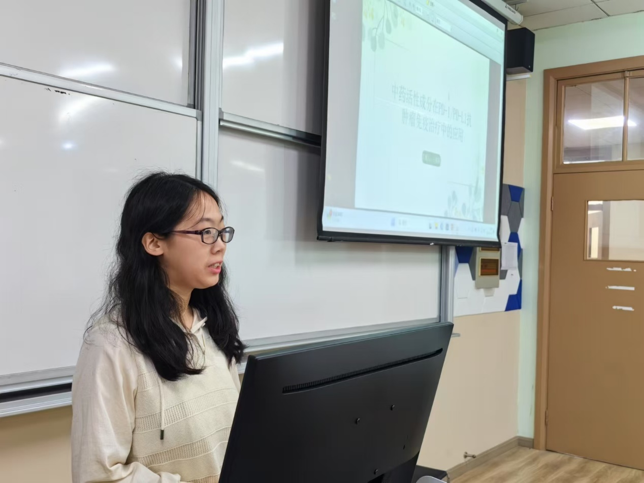 首次课程由王紫阳同学开讲,报告主题是中药活性成分在PD-1/PD-L1抗肿瘤免疫治疗中的应用。王紫阳同学首先为我们介绍了当下癌症领域的研究背景及癌症的临床治疗手段,接着讲述了中药结合PD-1/PD-L1的免疫治疗方法及近年人们关于中药活性物质在癌症临床研究的辅助应用,比如黄芪多糖对PD-L1的调节减弱黑色素瘤干细胞特性的诱导并克服免疫逃避、丹参酮IIA通过诱导ER应激和JNK活化抑制非小细胞肺癌肿瘤生长及增强抗PD-1免疫治疗等。