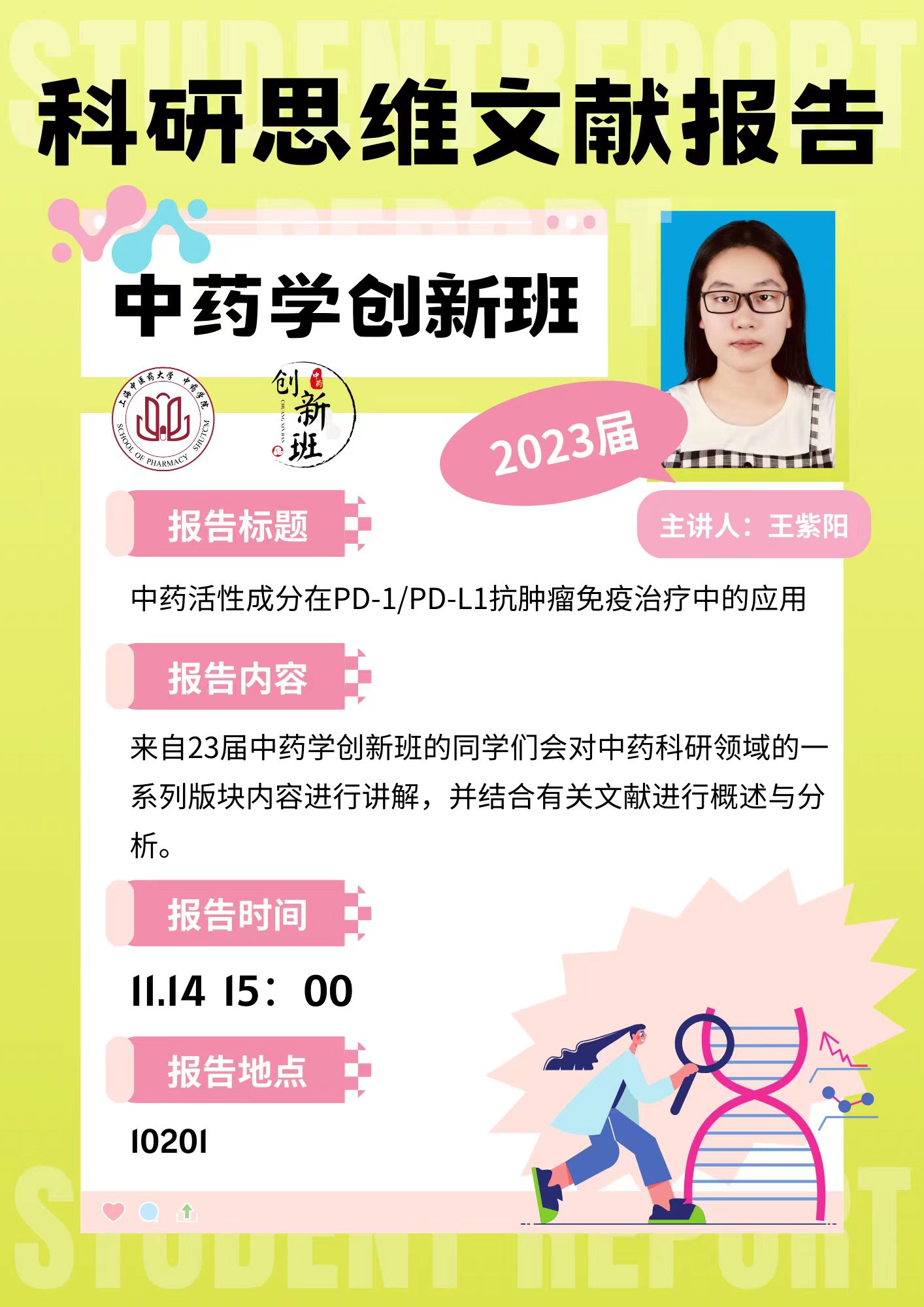 首次课程由王紫阳同学开讲,报告主题是中药活性成分在PD-1/PD-L1抗肿瘤免疫治疗中的应用。王紫阳同学首先为我们介绍了当下癌症领域的研究背景及癌症的临床治疗手段,接着讲述了中药结合PD-1/PD-L1的免疫治疗方法及近年人们关于中药活性物质在癌症临床研究的辅助应用,比如黄芪多糖对PD-L1的调节减弱黑色素瘤干细胞特性的诱导并克服免疫逃避、丹参酮IIA通过诱导ER应激和JNK活化抑制非小细胞肺癌肿瘤生长及增强抗PD-1免疫治疗等。