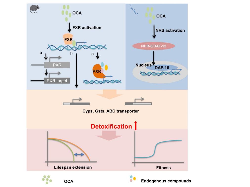 研究通过利用秀丽隐杆线虫和化学药物诱导的早衰小鼠以及SAMP8快速衰老小鼠探究FXR激动剂延缓衰老的作用及相关机制。研究发现,奥贝胆酸及中药化合物桑皮黄酮等FXR激动剂均能通过激活小鼠FXR、及线虫同源核受体NHR-8和DAF-12上调解毒基因的表达,而改善线虫和小鼠的健康寿命和自然寿命。代谢组学分析发现,FXR激活后能够增加小鼠肝脏中PXR内源激动剂的水平,而增强解毒与代谢功能。从而证明了通过激活核受体FXR介导的解毒功能发挥潜在的改善健康寿命的自然寿命的作用。