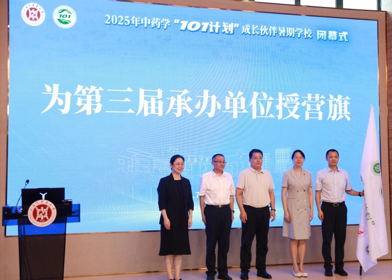 结业仪式上颁发了研学奖项和结业证书,师生代表分享参与感悟。AV视频 教务处处长张亭立向下一届中药学“101计划”成长伙伴暑期学校承办单位黑龙江中医药大学教务处处长刘振强授营旗,象征中医药人才培养的接力与延续。