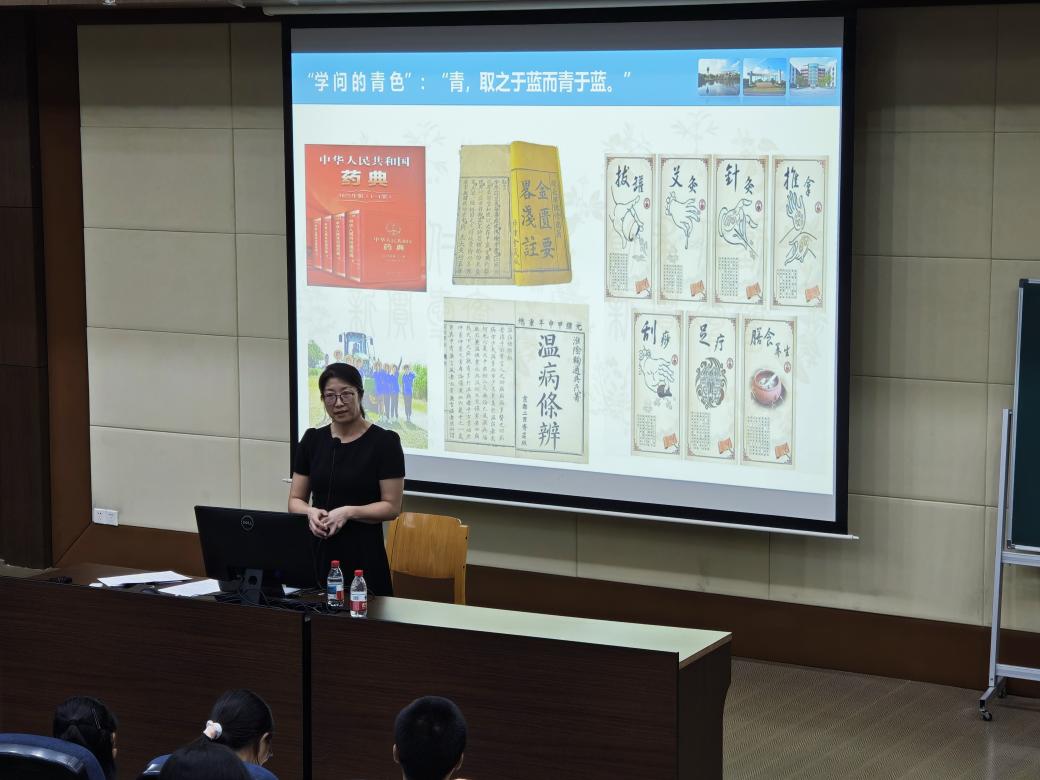 车荣华书记以“相遇——与中医药的双向奔赴”为切入点,破除“中医药是玄学”的误解。她指出,中医药是蕴含哲学智慧的生命科学,“整体观念”强调人与自然的平衡,“辨证论治”注重个性化调理,与现代医学互补。从《本草纲目》的千年智慧到现代科学的应用,从针灸到复方药剂,中医药始终守护人类健康。车书记强调,中医药是中华文明的瑰宝,鼓励新生以传承者身份深入这一领域。在“解码——融入血脉的精神基因”部分,车荣华书记阐释了“仁、精、诚”的中医药精神:“仁”即仁心济世,“精”为精益求精,“诚”是诚信求真。她以屠呦呦、裘沛然为例,勉励新生将这一精神融入学习与实践中。谈及“使命——新时代呼唤的中药人”,车荣华书记指出,新时代中医药人才需“顶天立地、守正创新”,既要具备科研创新能力,攻克“卡脖子”难题,也要扎根实践服务社会,同时懂管理、善沟通、通人文,成为中医药“走出去”的桥梁。在“底色——未来锻造何种人生”环节,车书记提出“四色底色”:信念的红色、学问的青色、实践的黄色、身心的绿色,分别代表紧跟党和国家政策、钻研经典夯实基础、通过实践求真知、保持身心健康。