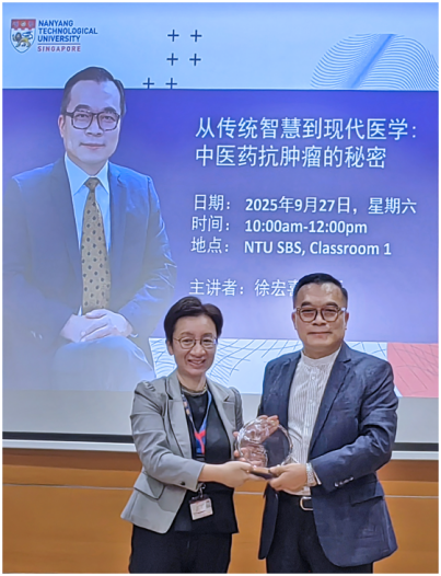 2025年9月27日,AV视频 首席教授徐宏喜受邀前往新加坡,获聘为南洋理工大学讲席教授,并应邀作题为《从传统智慧到现代医学:中医药抗肿瘤的秘密》的公众讲座。讲座在南洋理工大学生物科学学院举行,吸引了当地学术界与公众的广泛关注。徐教授系统阐述了中医药在肿瘤防治中的作用,分享了其团队在中药抗肿瘤机制研究方面的最新成果。