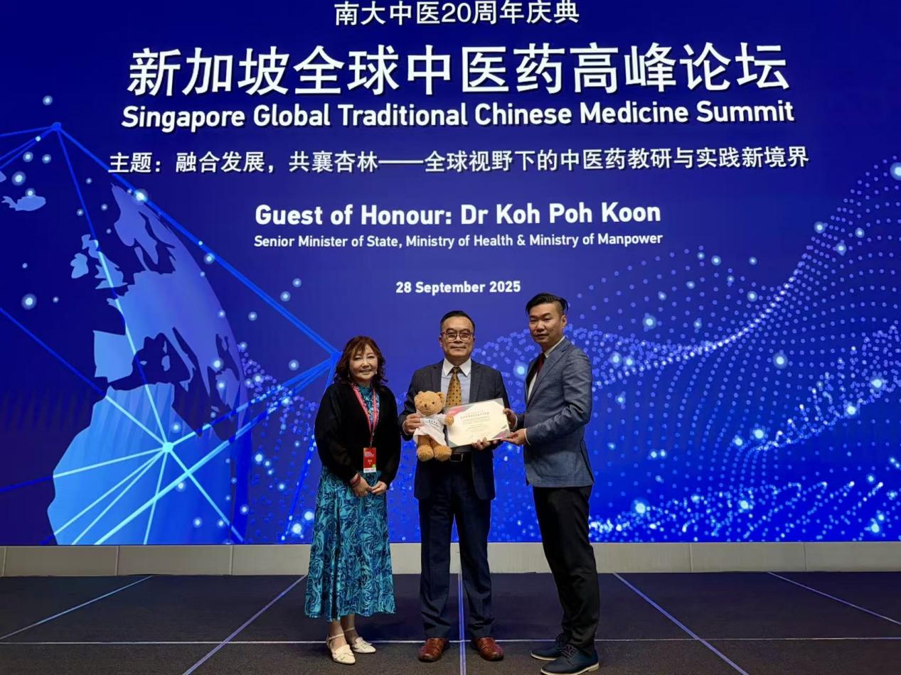 次日,徐宏喜教授受邀出席2025新加坡全球中医药高峰论坛,与来自中国大陆、香港及东南亚的多位知名专家交流中医药国际化发展的新方向。出席论坛的嘉宾还有国医大师王琦院士、王庆国教授、王晞星教授、北京中医药大学校长唐志书、香港浸会大学副校长吕爱平教授、广州中医药大学副校长刘中秋教授等。