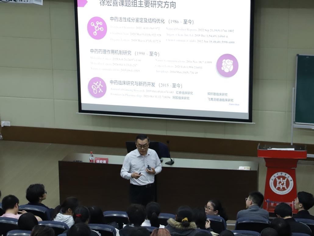 同学们,你们知道我们咳嗽常喝的鲜竹沥,到底是什么成分在起效吗?”徐宏喜教授一开场,便以家喻户晓的“鲜竹沥”为例,瞬间点燃了现场气氛。紧接着徐教授从六味地黄丸的多种剂型衍生,一个个生动具体的案例,如同抽丝剥茧,将当前中药研究的现状、热点与面临的挑战清晰地呈现在同学们面前。徐教授贯通中西,引经据典,其讲述既展现了中医药的博大精深,也以国际化的视野指出了其在现代化、科学化道路上必须直面的发展瓶颈会场不时爆发出会心的笑声和热烈的掌声。