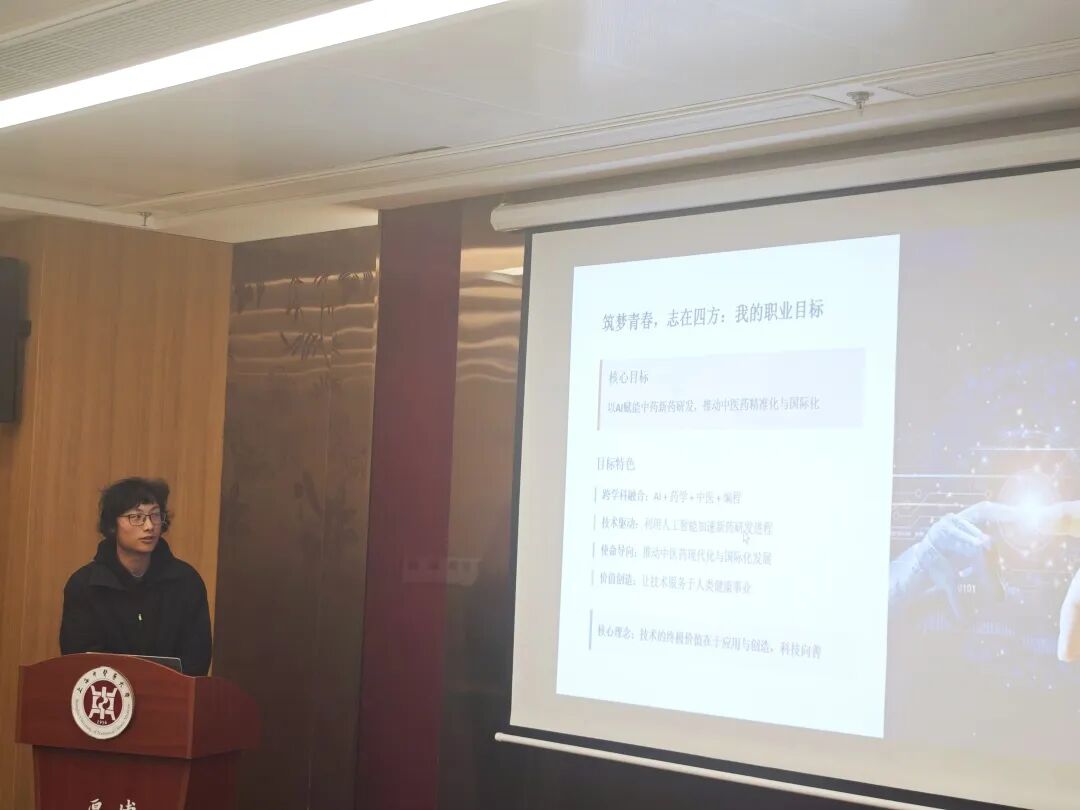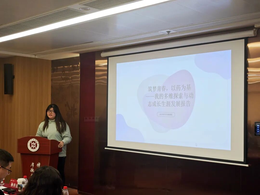 大赛在紧张而热烈的氛围中正式拉开帷幕。来自学院各年级的八位优秀选手张玉洁、陈愉、陈思语、庄靖铭、陈智杨、孙笑悦、孔语佳、陈妍蓉依次登台,展开了精彩纷呈的职业生涯规划展示。八位选手立足专业特色,结合个人兴趣、能力特点与时代需求,展开了对未来的深度思考与精心规划。他们的职业目标多元而清晰,涵盖了中药研发、质量控制、药品注册与监管等多个方向。